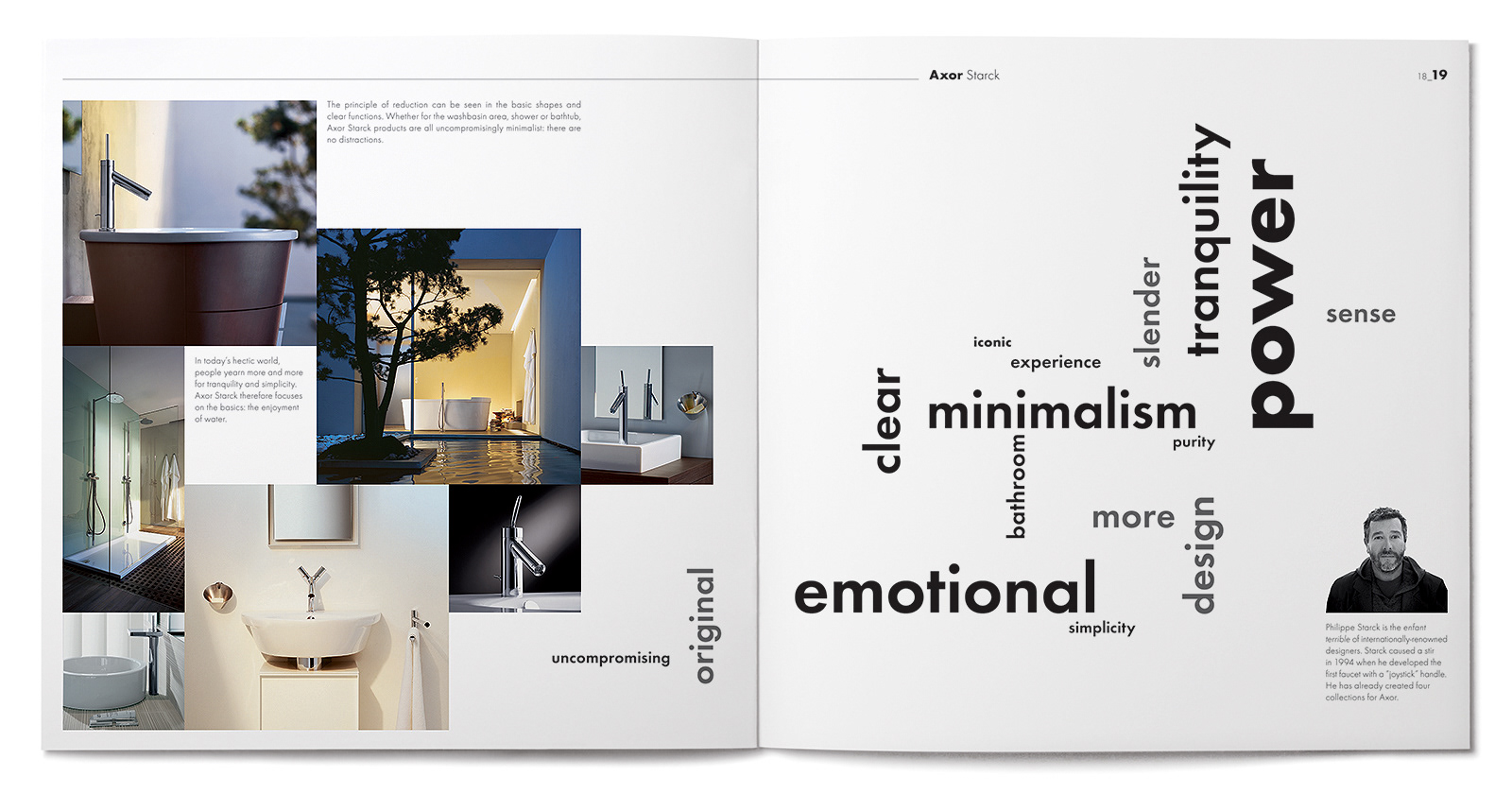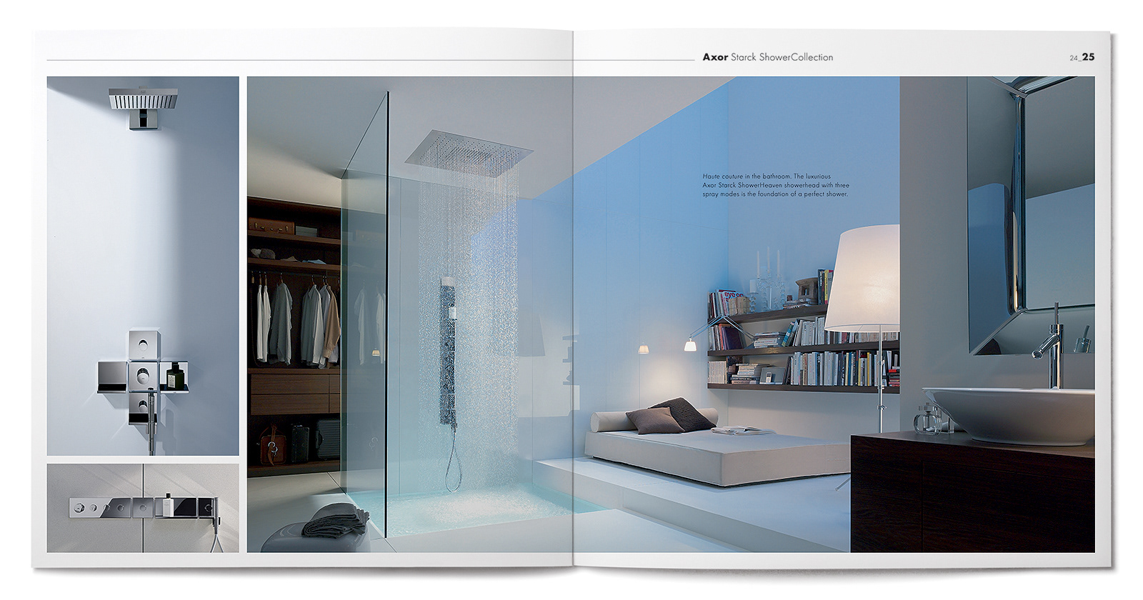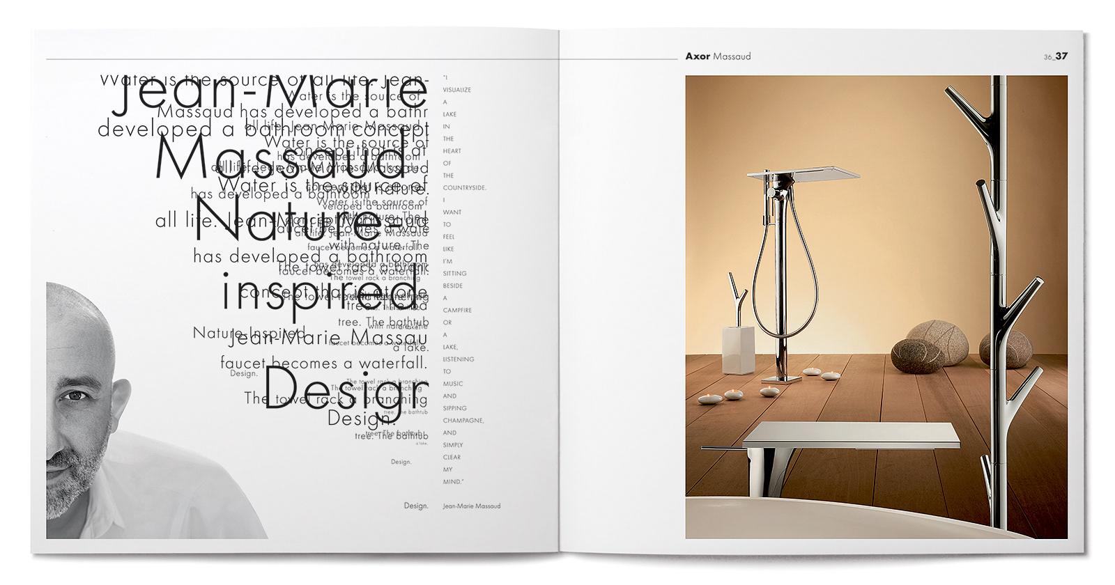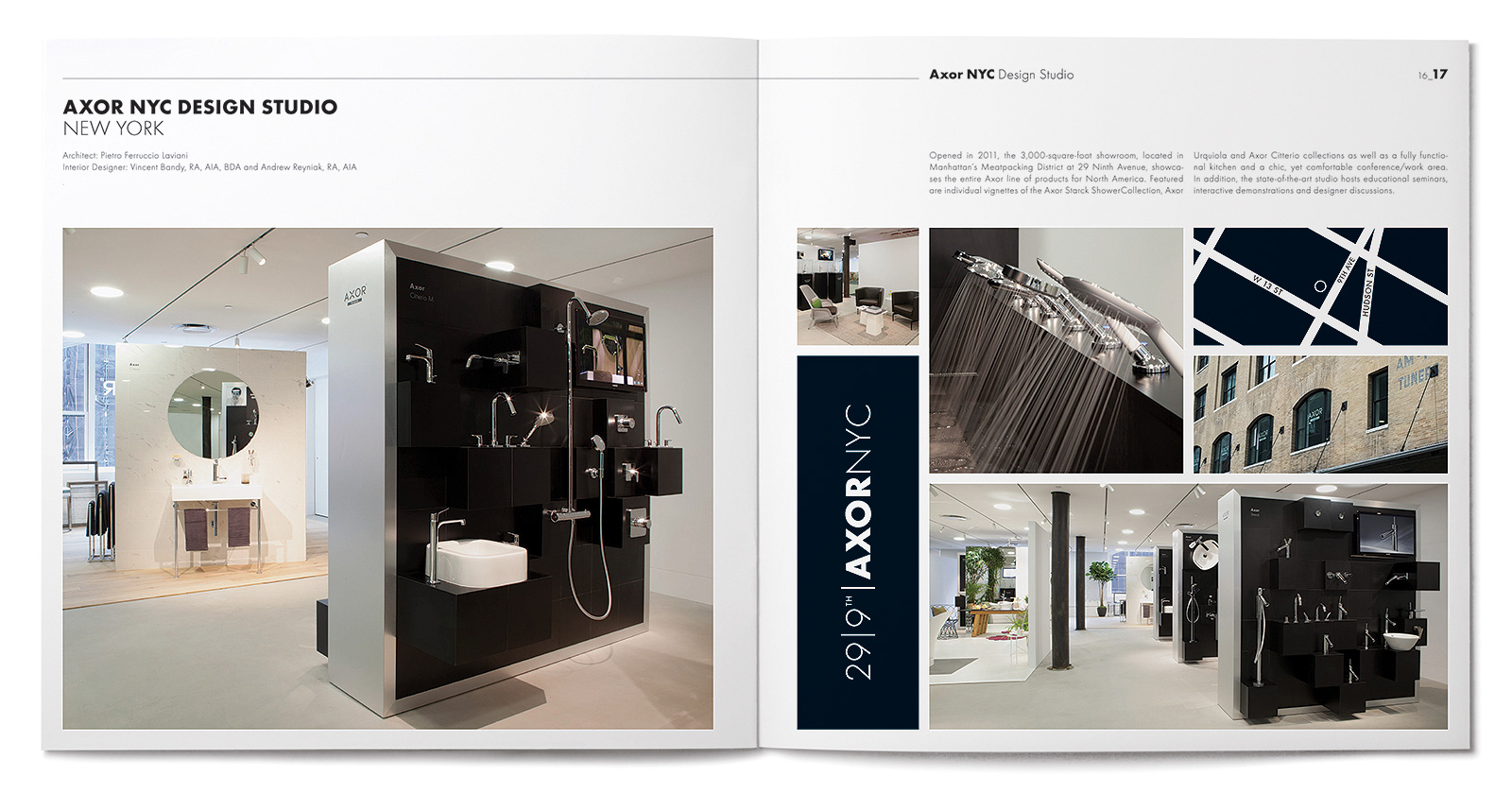 We were asked to reinterpret the European-worded and sized Axor Essentials brochure design from their German headquarters into a manner that would fit the U.S. page sizing and language. We adjusted the design to fit the square page format, looked for overall improvement while staying true to the design and branding intent from Germany.
