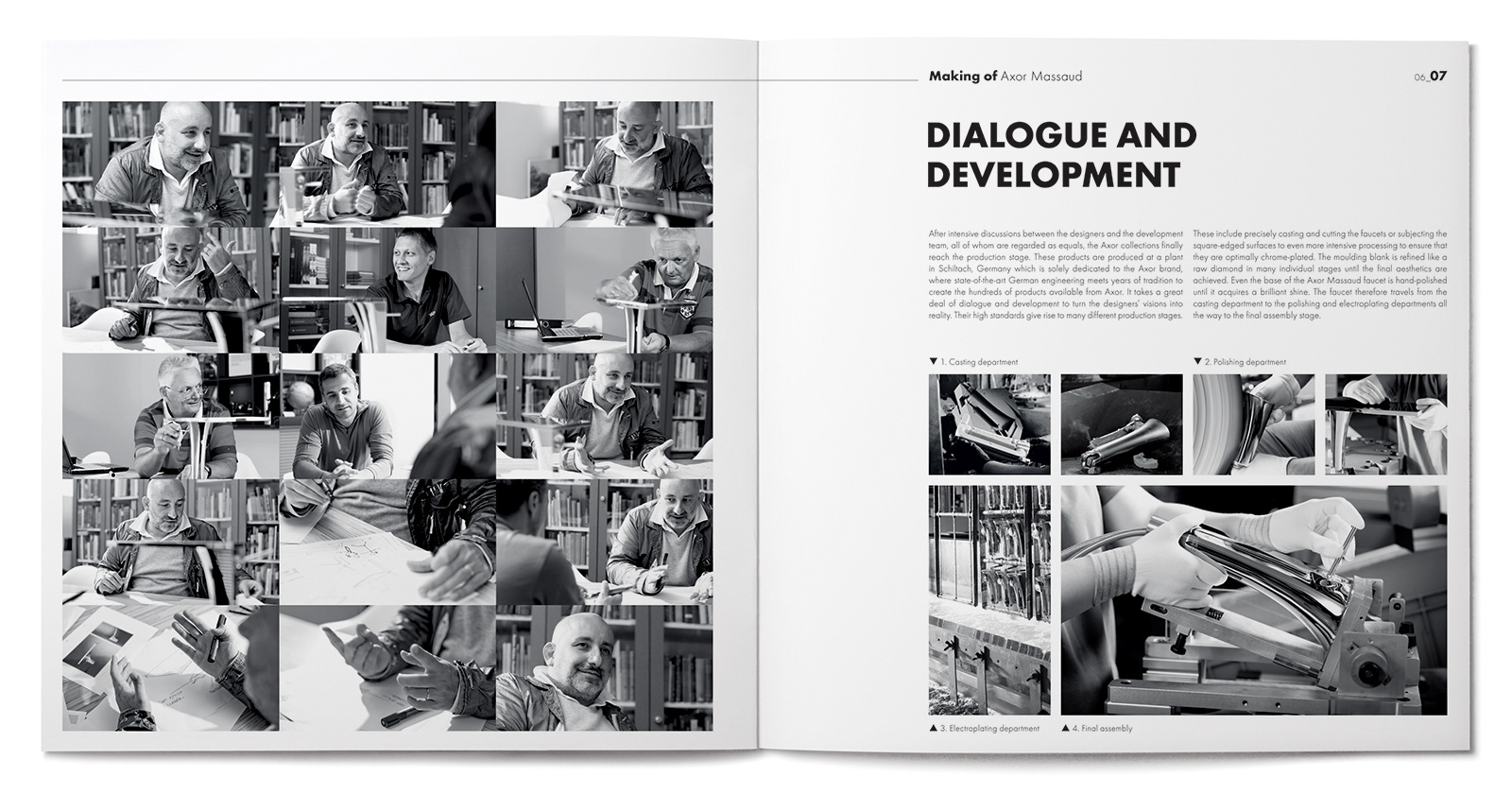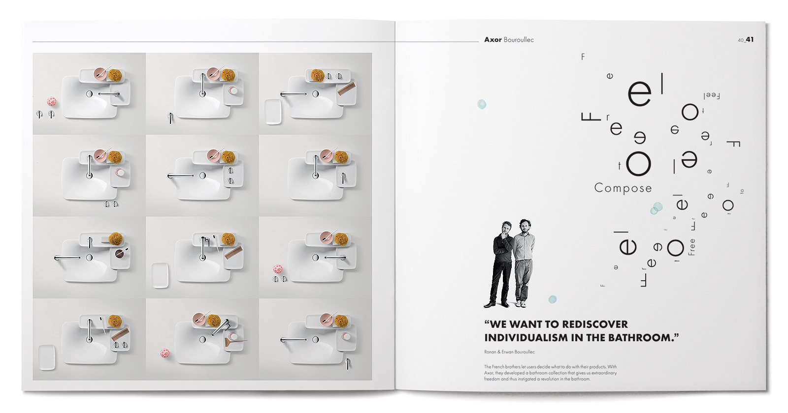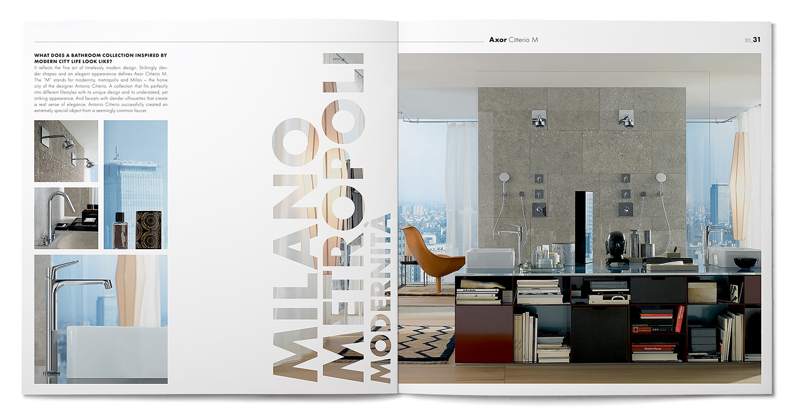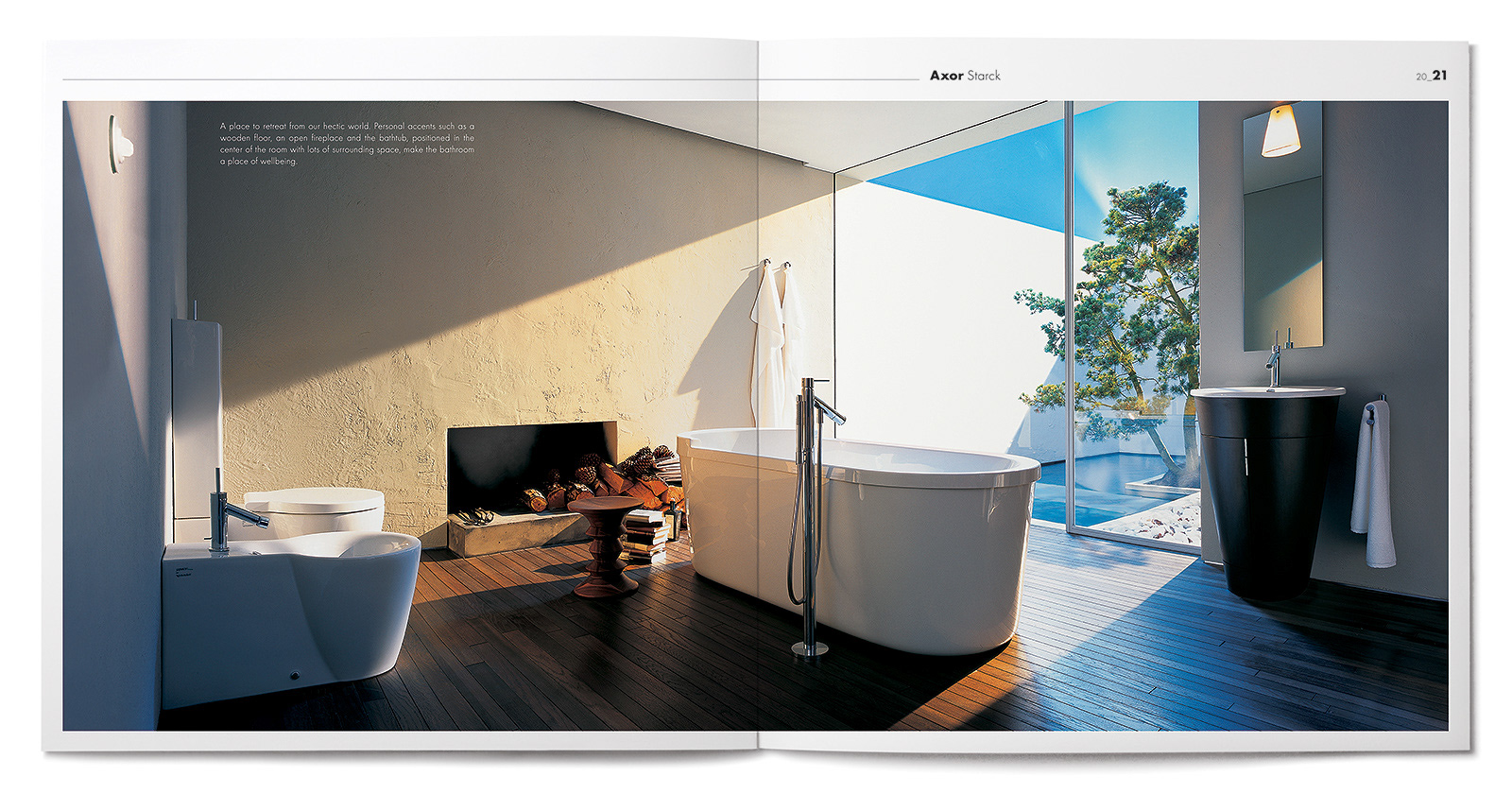We were asked to reinterpret the European-worded and sized Axor Essentials brochure design from their German headquarters into a manner that would fit the U.S. page sizing and language. We adjusted the design to fit the square page format, looked for overall improvement while staying true to the design and branding intent from Germany.