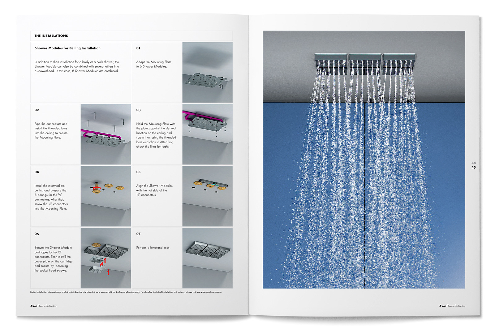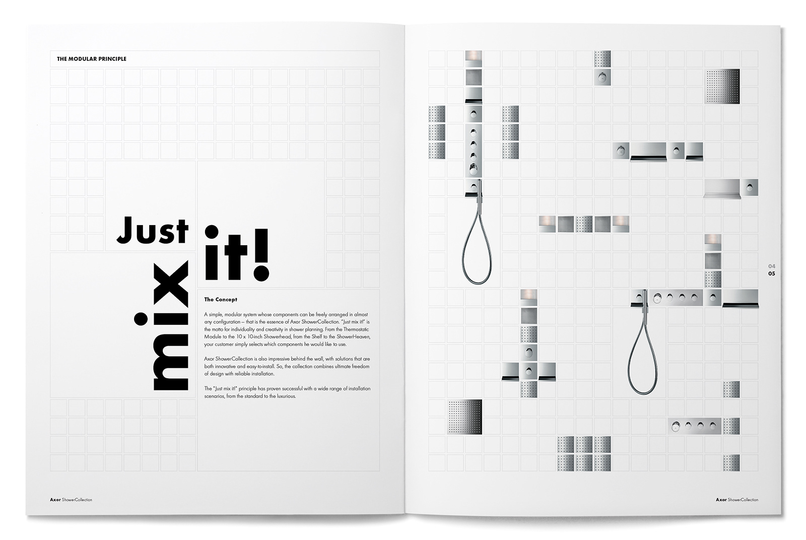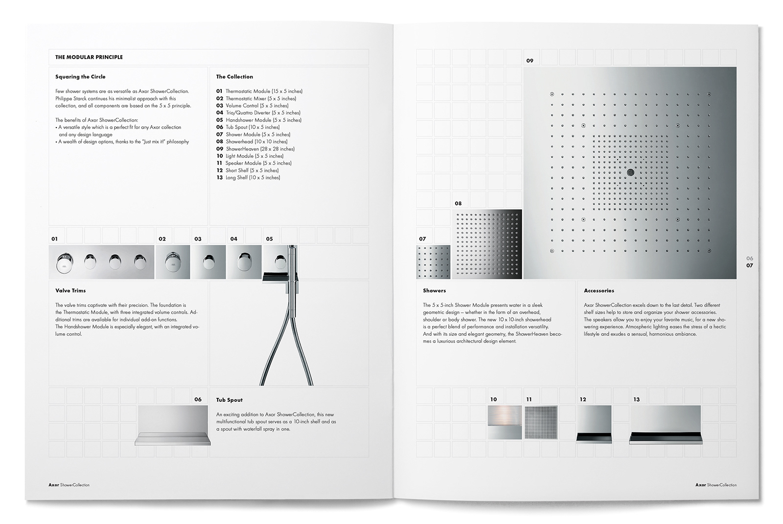 We were asked to reinterpret the European-worded and sized Axor ShowerCollection brochure design from their German headquarters into a manner that would fit the U.S. page sizing and language. We refined the small outlined square page grid and typography usage while staying true to the design and branding intent from Germany.