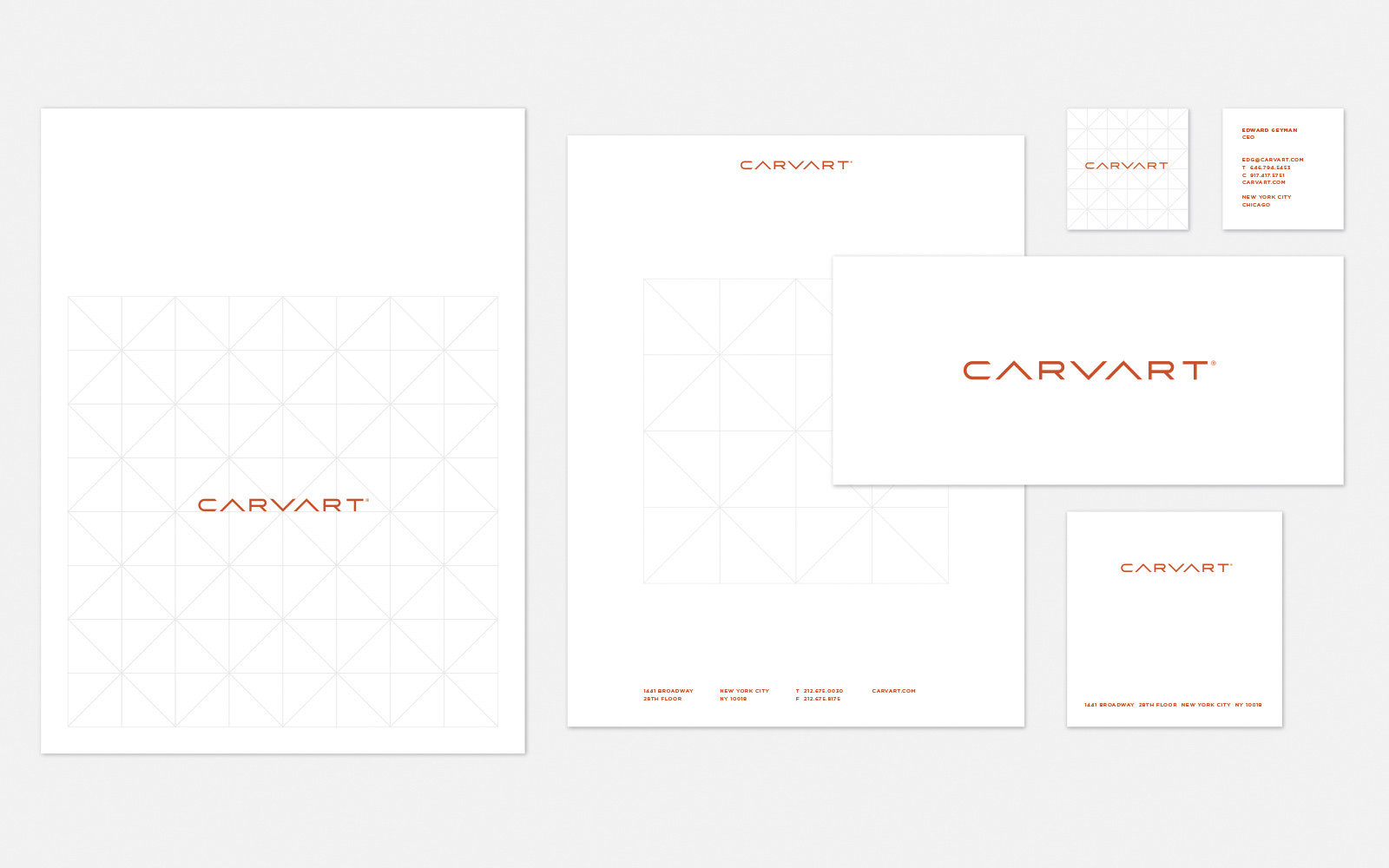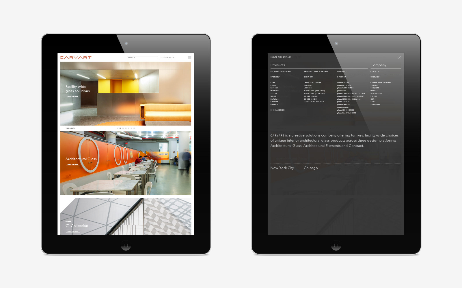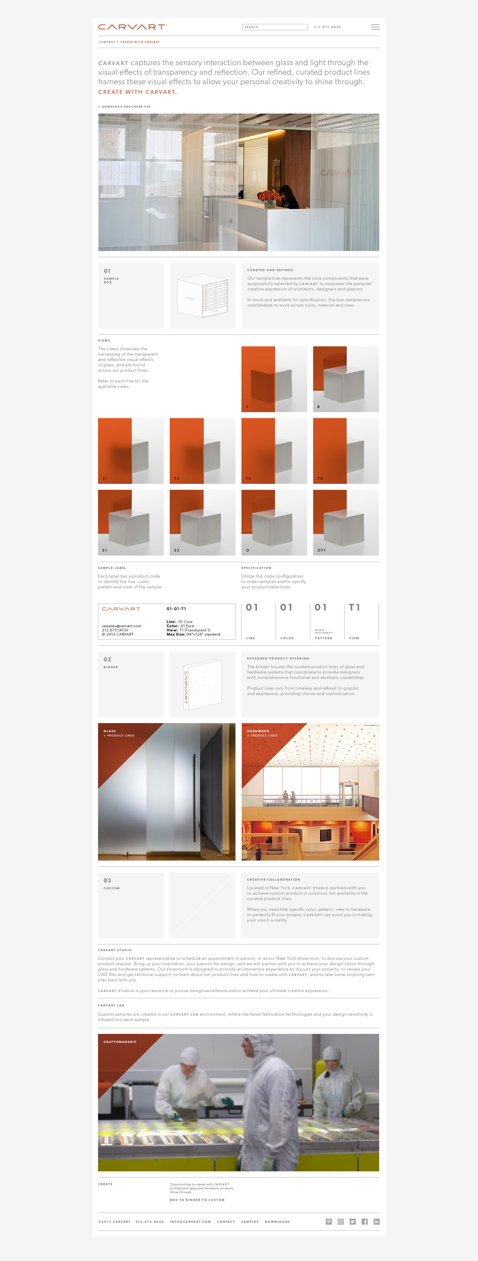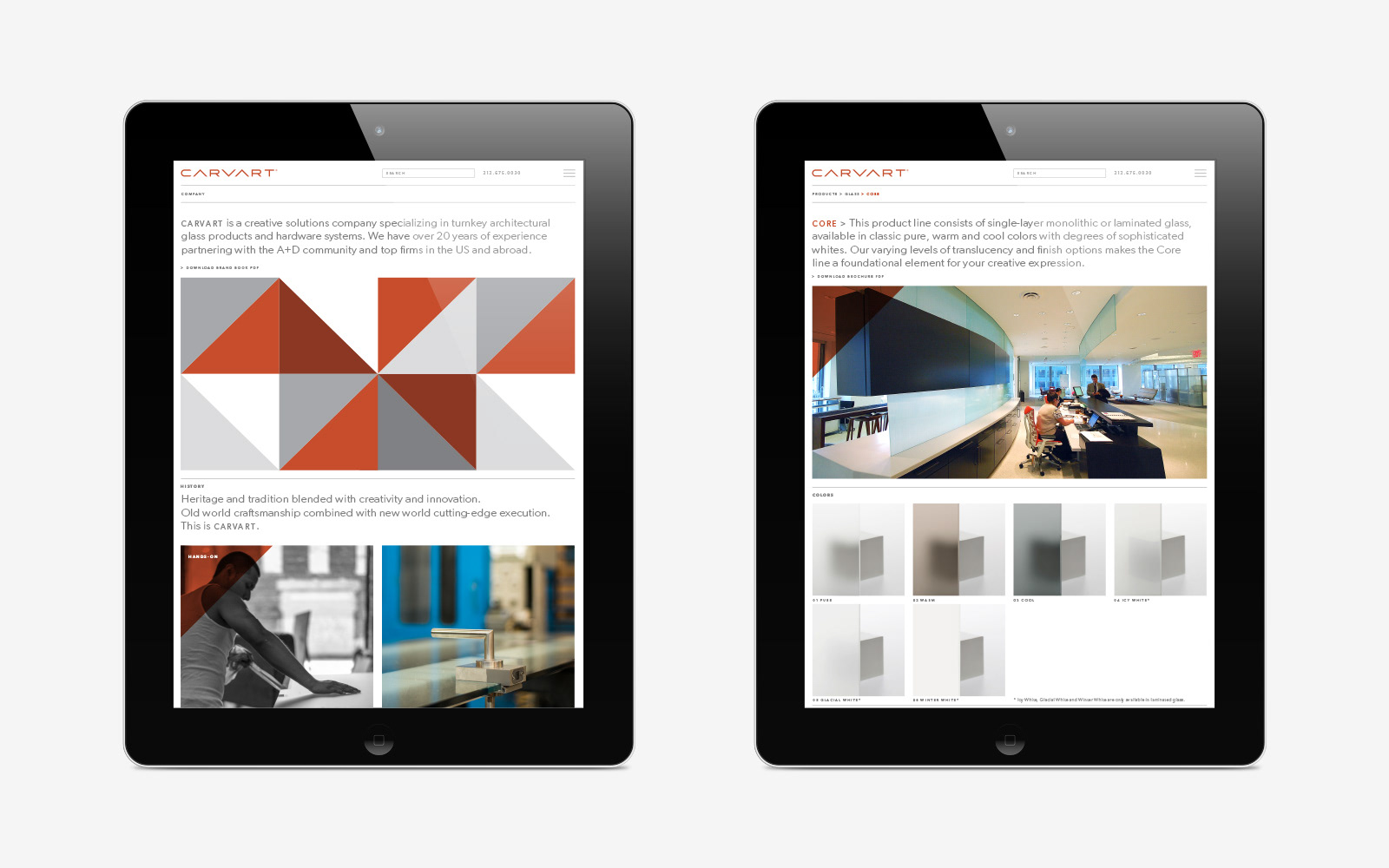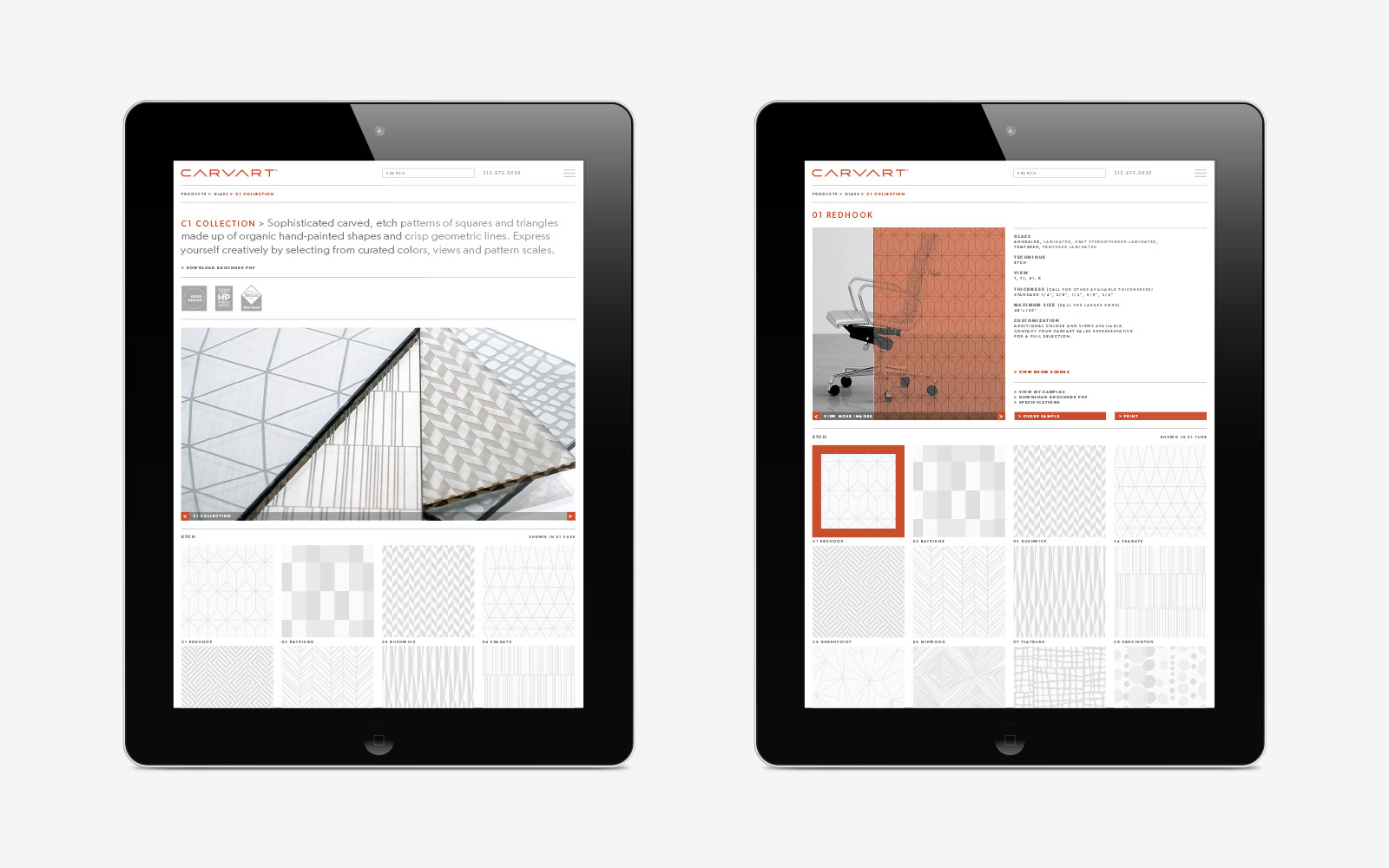 We became aware of CARVART while attending a trade show in Chicago. They had great glass products on display but no matching brand presence or design support. We offered our help and they challenged us to create their strategic brand platform, curate their product lines and apply their branding to touchpoints that would connect with their sophisticated architect and designer audience. We collaborated with CARVART to define their message, redraw their logo and develop an identity system of colors, typography and patterns. The brand launch included a brand book, a binder with new product brochures, a shelved cube box to house curated product samples, and a redesigned New York City showroom. At the same trade show we met at the year before, NeoCon, the dimensional cube extension of the square brand motif was interpreted as a dynamic glass enclosure. Inside the booth was our first jointly curated Metallic product line which won a Best of NeoCon Silver Award. Overjoyed, we could not have imagined the awards success that would follow. Just a few years later CARVART moved into a permanent NeoCon showroom and a new New York City headquarters in Times Square. It’s been an amazing journey. Our work includes strategy, logo, stationery, brochures, catalogs, binders, packaging, showrooms, trade shows, website, product development, naming, advertising, sample mailers, e-blasts and PR creative direction.