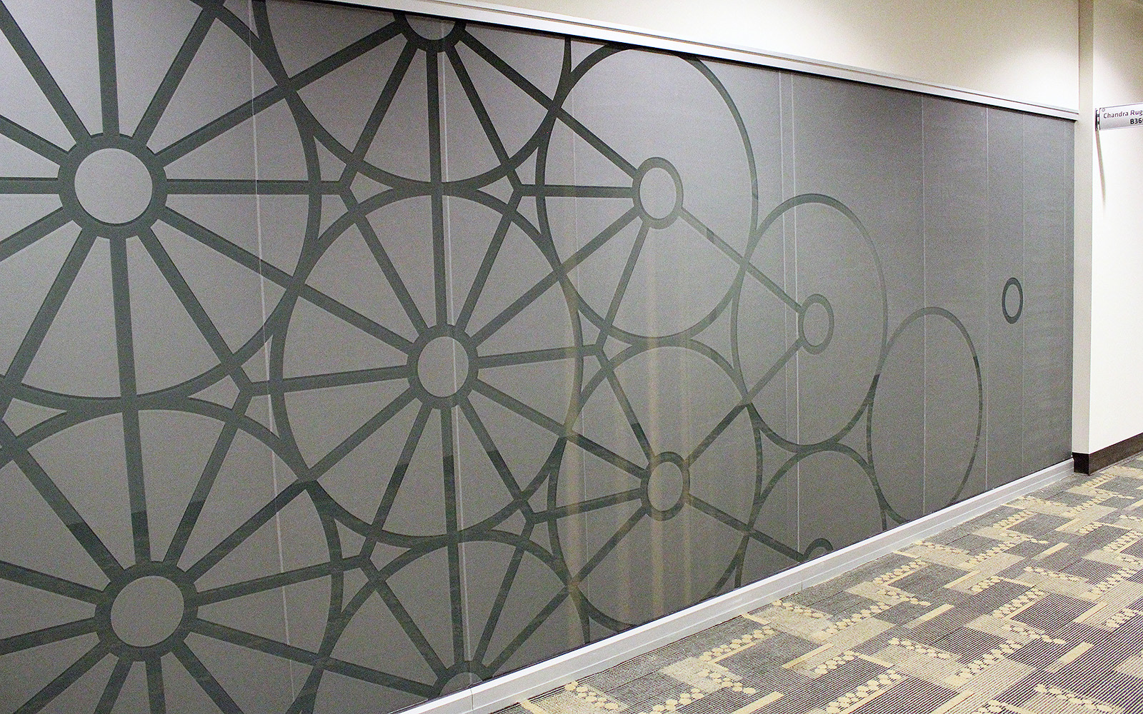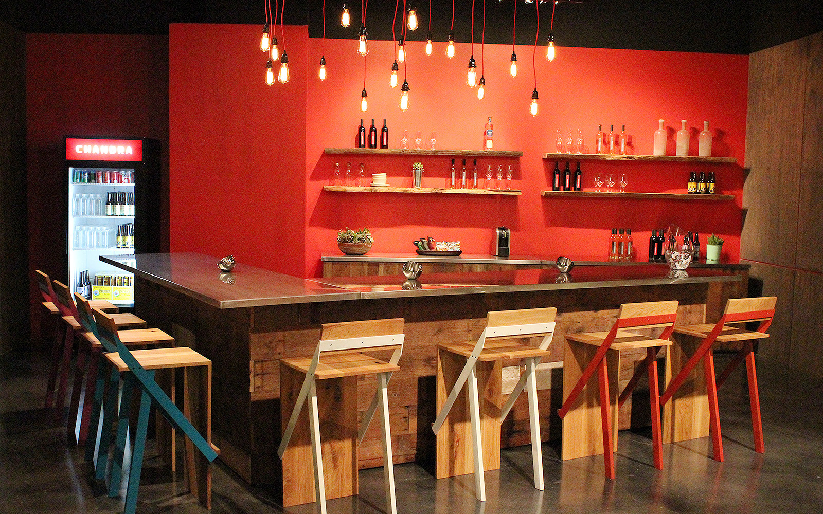 Chandra had grown and needed a larger space at the Las Vegas Market to showcase their products and to reinforce their brand. We were able to construct the floor plan to maximize traffic flow and to allow for inspirational room vignettes and a stocked hospitality bar, all while using materials and finishes that related to the High Point showroom experience. We extended its look of concrete floors, reclaimed barn wood and dimensional metal logos and patterns. We also created a sense of intrigue by sealing off sight lines into the space and had all guests enter the showroom through a branded entrance wall that led them to the interior vignettes and product areas.