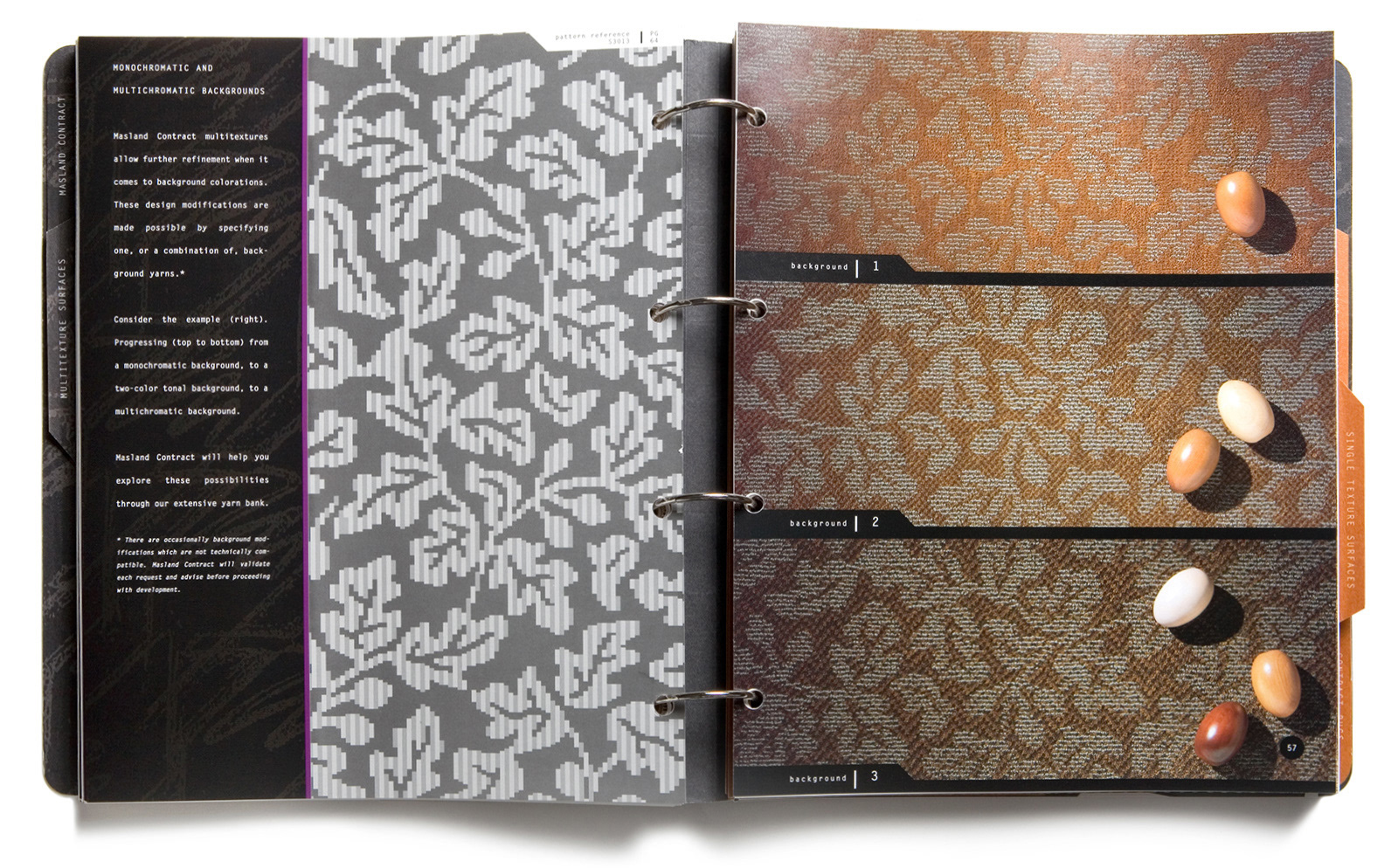 Surface. Texture. Pattern. Three influential considerations in carpet design and specification. The STP catalog design included the complete collection of Masland Contract carpet patterns available for specification by architects and designers. Mozaik was a companion catalog that focused on the cut-and-seam capabilities of Masland carpet, creating custom carpet installations and area rugs.