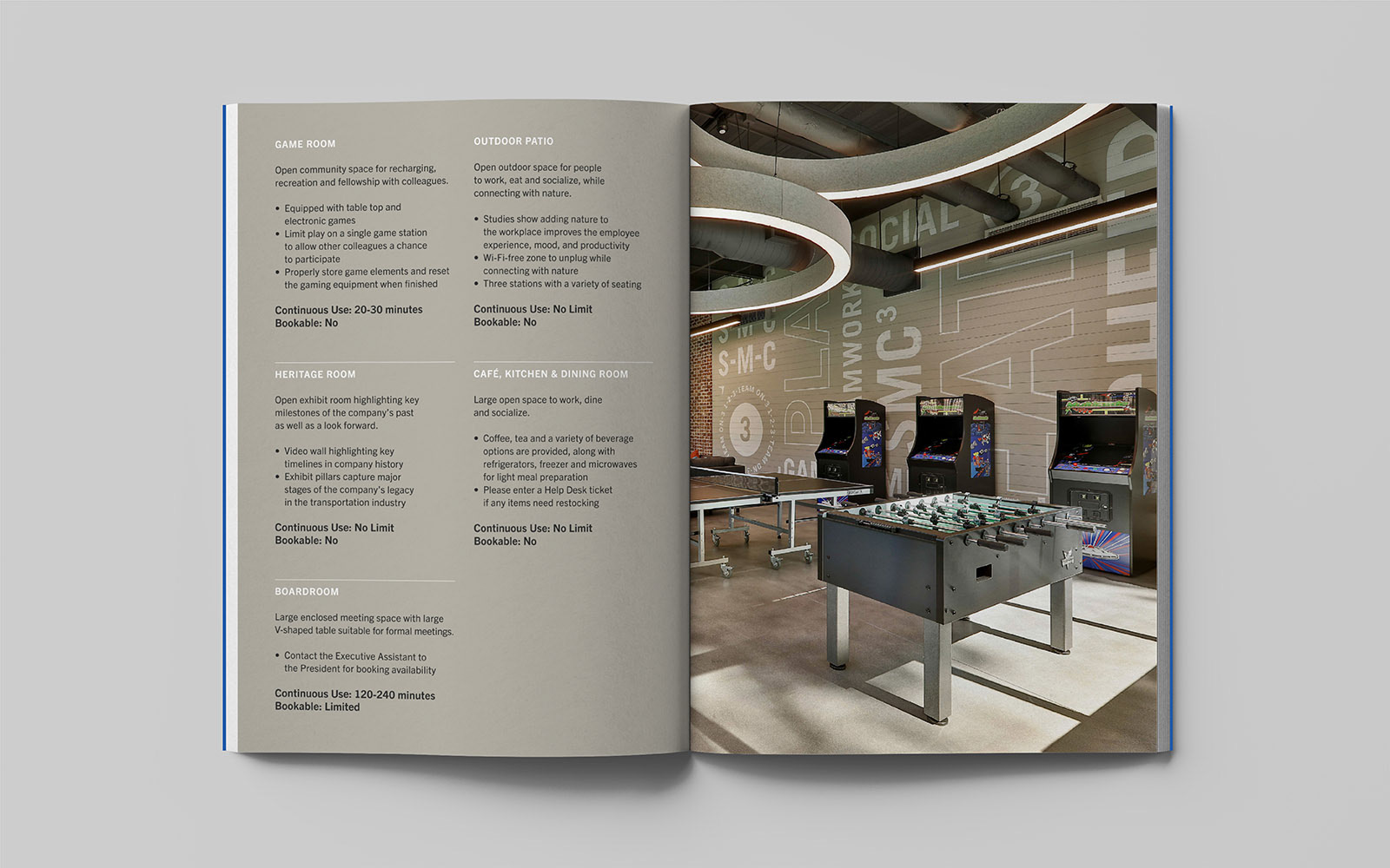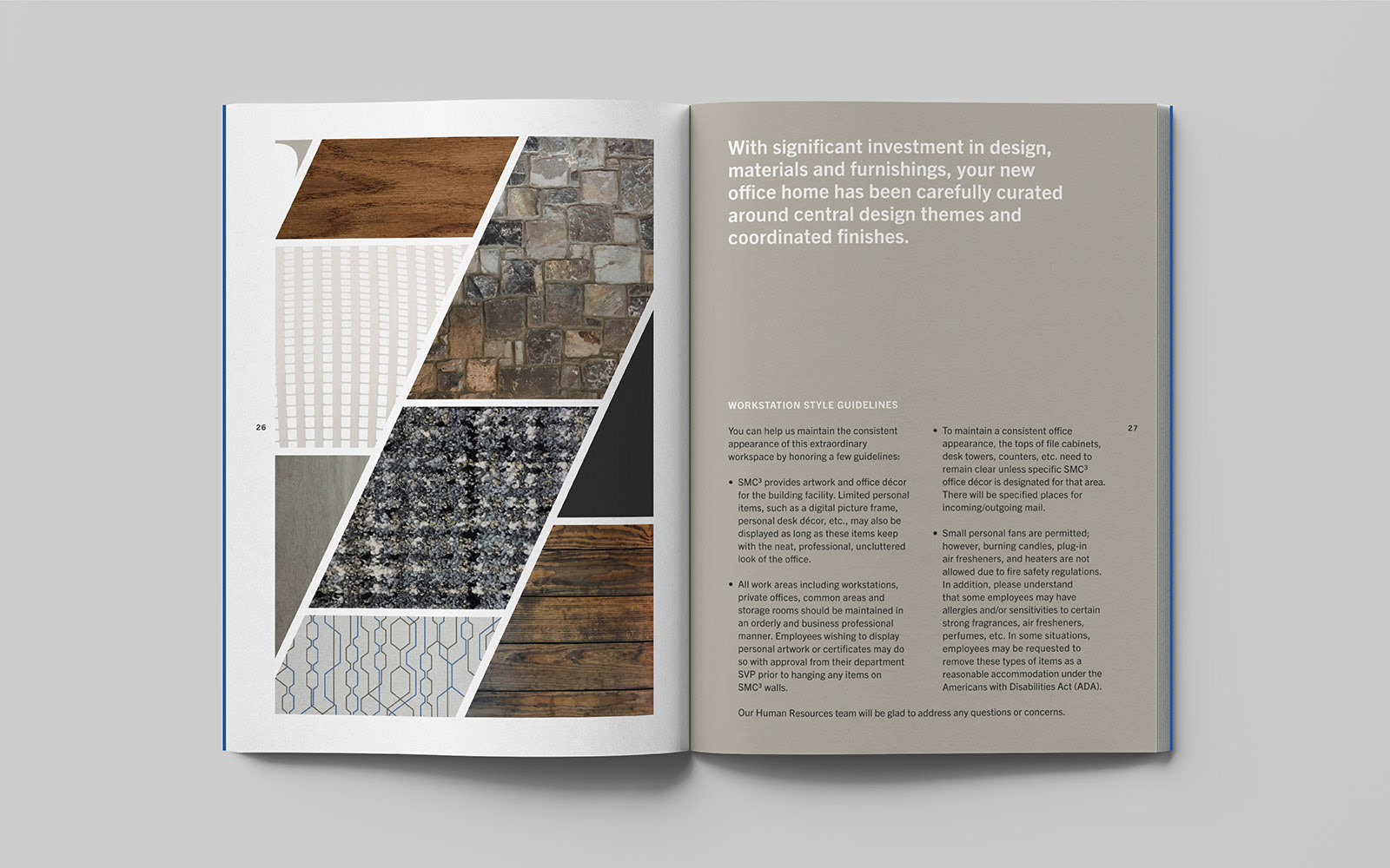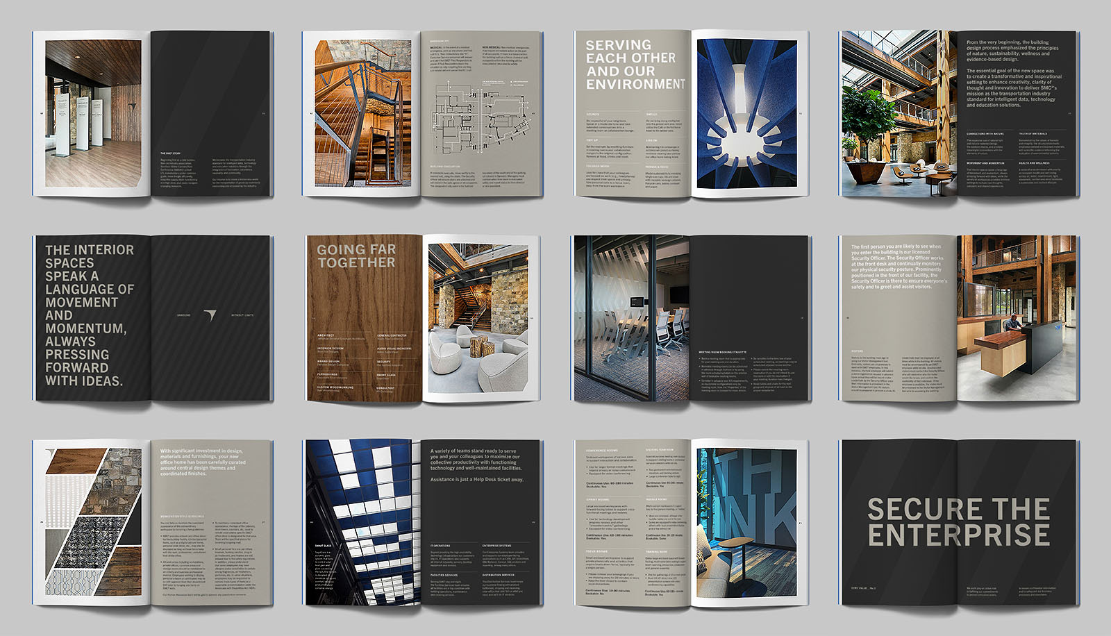 SMC3 is the transportation industry leader using intelligent data, technology and education to connect and empower their industry. They asked us to extend their brand message throughout their new corporate headquarters and launch brochure. After analyzing the SMC3 story, “movement" quickly became a central conceptual platform, in context of how SMC3 optimizes freight transportation and advances the industry through progress and innovation. We refreshed their symbol and called it “the arrow” for its strong visual language of forward motion, momentum and direction. The symbol drove the new identity system by repeating its specific angle to create the striped patterns.